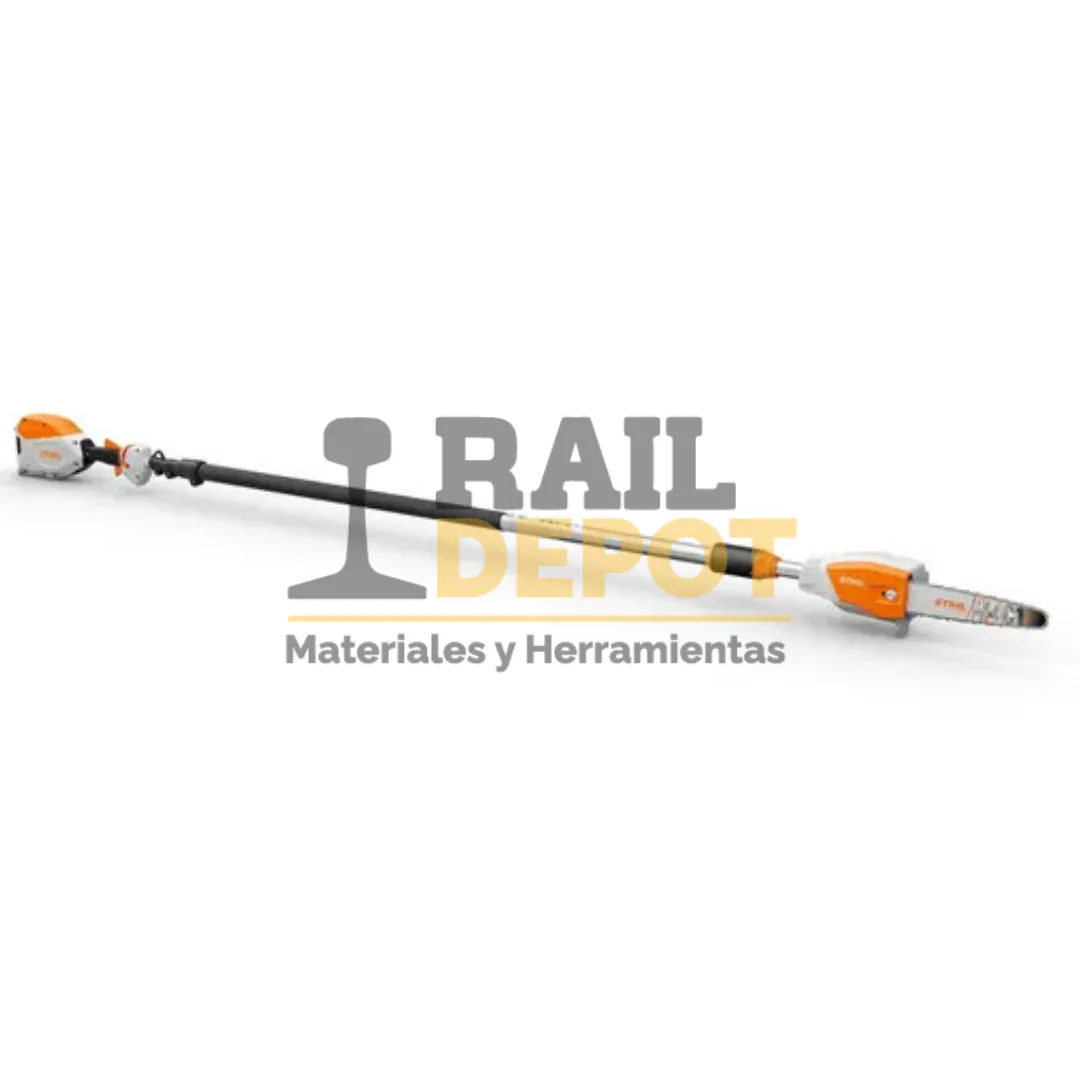 La podadora de altura a batería STIHL HTA 86, con una longitud total de hasta 390 cm, le proporcionará un útil apoyo en el trabajo para un mantenimiento cómodo de árboles de altura media. Entre quienes se beneficiarán del diseño altamente ergonómico que proporciona el eje telescópico rectangular estable se encuentran profesionales del mantenimiento de jardines y paisajes, tareas especializadas en bosques y autoridades públicas, así como así como personas que trabajan en entornos domésticos. El manguito de sujeción giratorio le permite aumentar rápidamente la longitud del eje hasta 120 cm según sea necesario. El eje permanece rígido contra fuerzas de torsión y flexión. La cadena de sierra PM3 de ¼” le permite cortar la madera de la manera que desee, de manera fácil y precisa. Gracias al alto rendimiento de corte, podrá realizar cortes limpios y eficientes. El motor EC premium combinado con una batería del sistema STIHL AP garantiza una conducción potente con un rendimiento constante. Funciona de forma tan silenciosa que incluso puedes trabajar en zonas sensibles al ruido, como entornos residenciales. La manija de control ergonómica es adecuada tanto para personas usuarios diestros y zurdos, al igual que el interruptor de bloqueo automático integrado. El manillar con protección antideslizante garantiza que puedas trabajar de forma eficiente y segura en todo momento, incluso en condiciones de lluvia. Otros beneficios incluyen: Tapa del tanque de aceite sin herramientas con tanque de aceite semitransparente para un llenado rápido y un monitoreo constante del nivel Gancho de rama resistente para agarrar esquejes sueltos de árboles de hasta 5 m de altura Todas las herramientas eléctricas a batería del sistema STIHL AP han sido diseñadas para usuarios profesionales y trabajo diario, incluso en condiciones climáticas adversas. Teniendo esto en cuenta, están certificados como a prueba de salpicaduras. La eficacia de esto también se verifica mediante exigentes pruebas internas. La prueba de salpicaduras de agua está alineada con el estándar IPX4, entre otros.