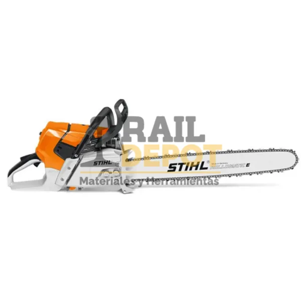 Motosierra de alto rendimiento para aplicaciones exigentes en espacios de alta densidad. Sistema antivibración STIHL, filtro HD2 con un excelente efecto de filtrado, bomba de aceite de alto rendimiento con suministro controlado para transportar grandes cantidades de aceite; recogedor de cadena de rodillos de serie.