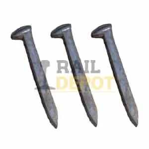 Un Clavo de Vía de 5/8” por 6” es un herraje ferroviario de forma grande, cuadrada, con una cabeza, diseñado para asegurar rieles y placas de asiento a los durmientes de la vía.