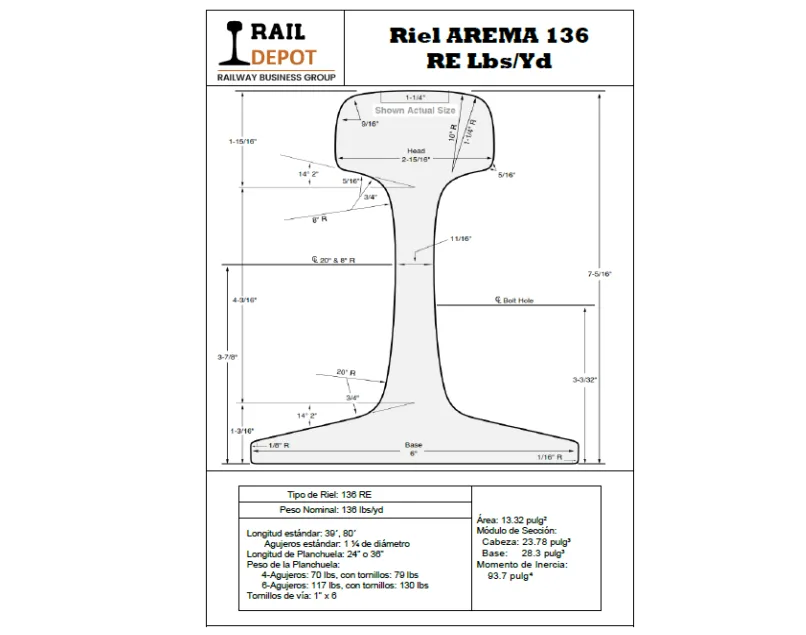 - Rendimiento Confiable: Diseñado para cumplir con los estándares de la Asociación de Ingenieros de Vías Férreas de América (AREMA), este riel ofrece un rendimiento confiable y consistente, asegurando una operación ferroviaria segura y eficiente.
